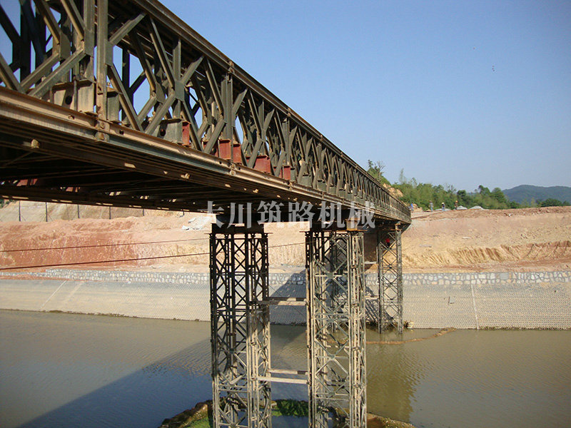 特點(diǎn):本鋼橋由國防科技大學(xué)全程指導(dǎo)和監(jiān)督安裝,滿足荷載80T施工車輛通行,因施工場地要求,采用貝雷梁組合式橋墩,安裝拆除方便,穩(wěn)定性好。采用推出法安裝,安裝周期20天,于2011年5月25日通車。