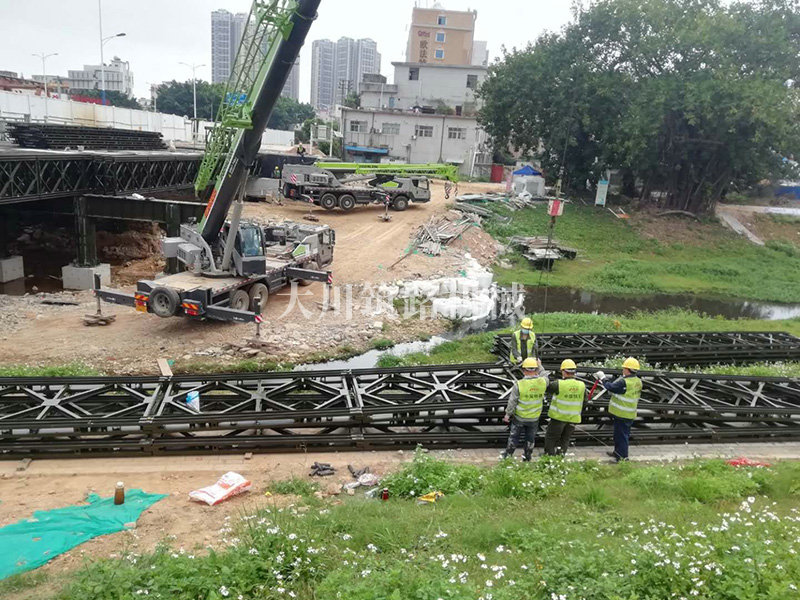 鋼橋型號:48m*16m加強(qiáng)型6(車道)+2(人行通道)+防撞護(hù)欄,上承式鋼橋,橫向布置35排貝雷梁,分兩跨,橋墩為單排四柱式φ800鋼管樁,上表鋪混泥土。